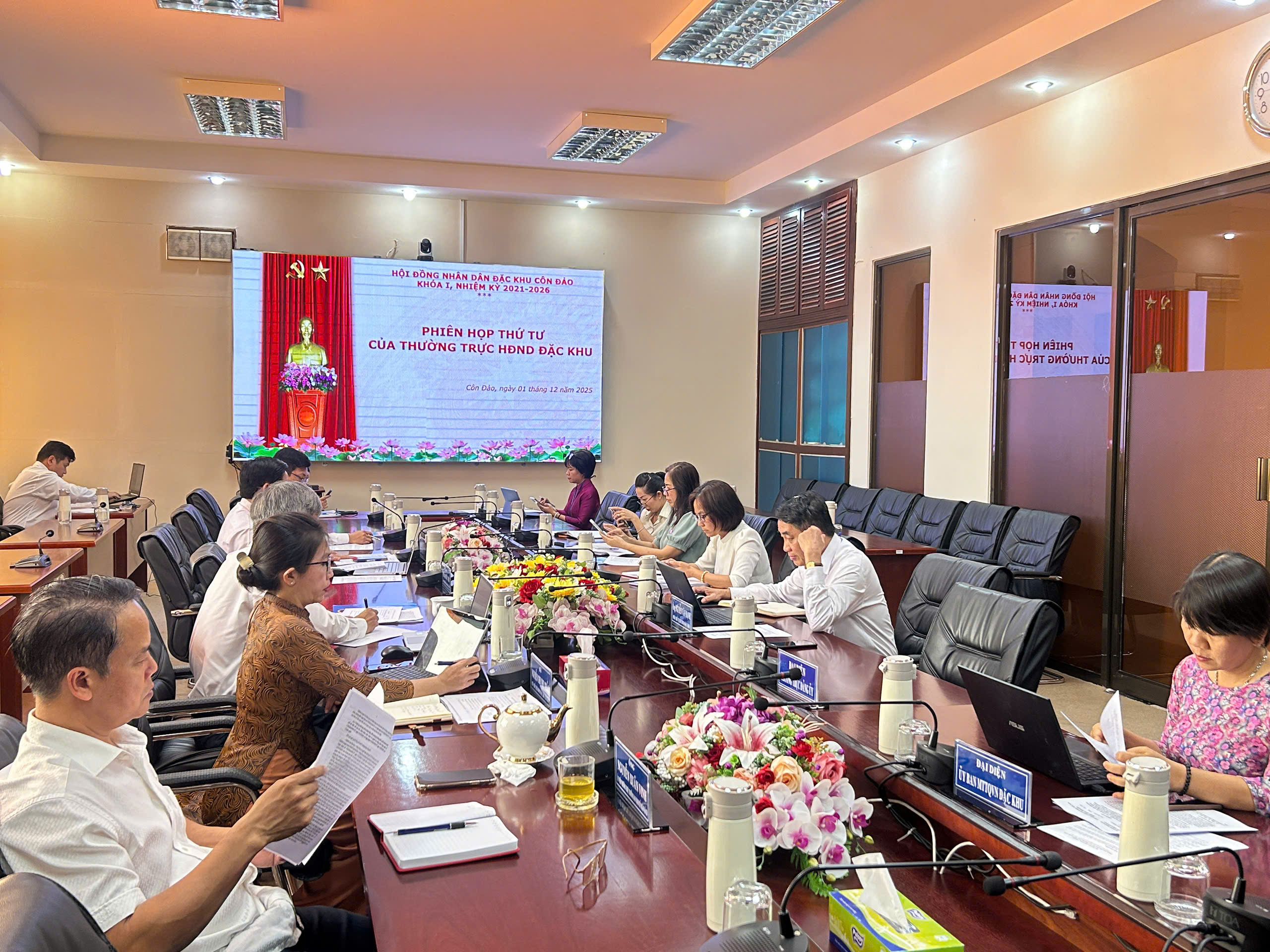 Côn Đảo, ngày 01 tháng 12 năm 2025 - Thực hiện quy chế làm việc và chương trình công tác, ngày 01/12/2025, tại Phòng họp Trụ sở Hội đồng nhân dân (HĐND) và Ủy ban nhân dân (UBND) đặc khu, Thường trực HĐND đặc khu Côn Đảo khóa I, nhiệm kỳ 2021-2026 đã tổ chức thành công Phiên họp thứ Tư. Phiên họp tập trung vào việc thảo luận, quyết định các nội dung quan trọng thuộc thẩm quyền giữa hai kỳ họp, trọng tâm là rà soát công tác chuẩn bị cho Kỳ họp thường lệ cuối năm 2025.