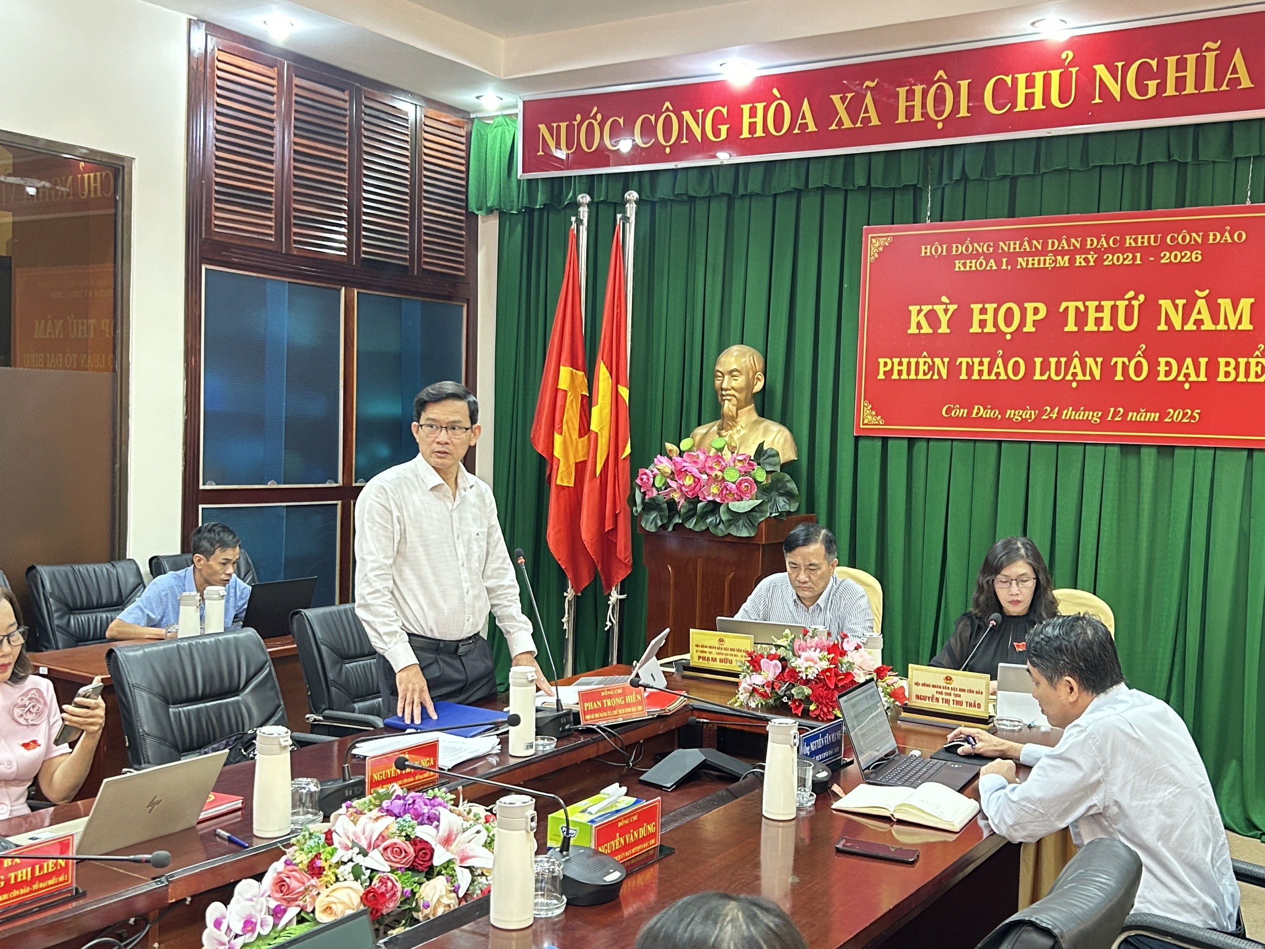 Côn Đảo, ngày 24 tháng 12 năm 2025 - Trong khuôn khổ Kỳ họp thường lệ cuối năm 2025 (Kỳ họp thứ Năm), chiều ngày 24/12/2025, Hội đồng nhân dân (HĐND) đặc khu Côn Đảo khóa I, nhiệm kỳ 2021 - 2026 đã tổ chức phiên thảo luận Tổ đại biểu tại phòng họp Trụ sở HĐND và UBND đặc khu. Phiên thảo luận diễn ra dưới sự chủ trì của bà Nguyễn Thị Thu Thảo – Phó Chủ tịch HĐND đặc khu và ông Phạm Hữu Trí – Trưởng Ban Văn hóa - Xã hội HĐND đặc khu.